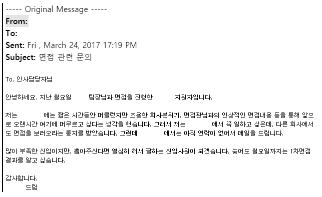 결국, 합격 메일도 탈락 메일도 받지 못했다. 그래서 회사에 메일을 한 통 보냈다.